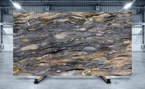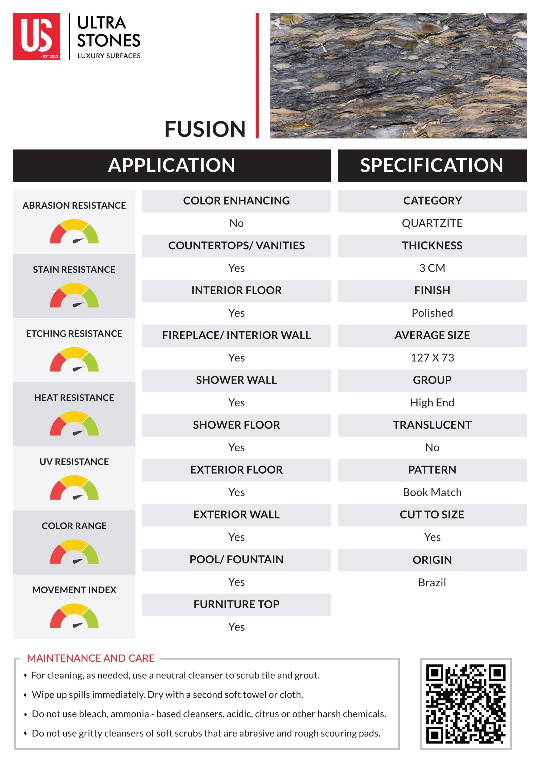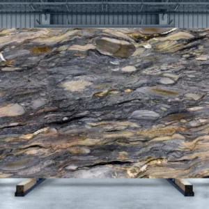 Fusion quartzite is known for its bold display of colors. Bright yellows, moody blues, greys, and whites come together to create an awe-inspiring abstract painting. The bold and expressive personality of Fusion quartzite makes it an ideal choice for creating focal points in your interiors. Its enduring strength offers resistance to staining, scratching, and heat. Create artistic and functional spaces with Fusion quartzite.