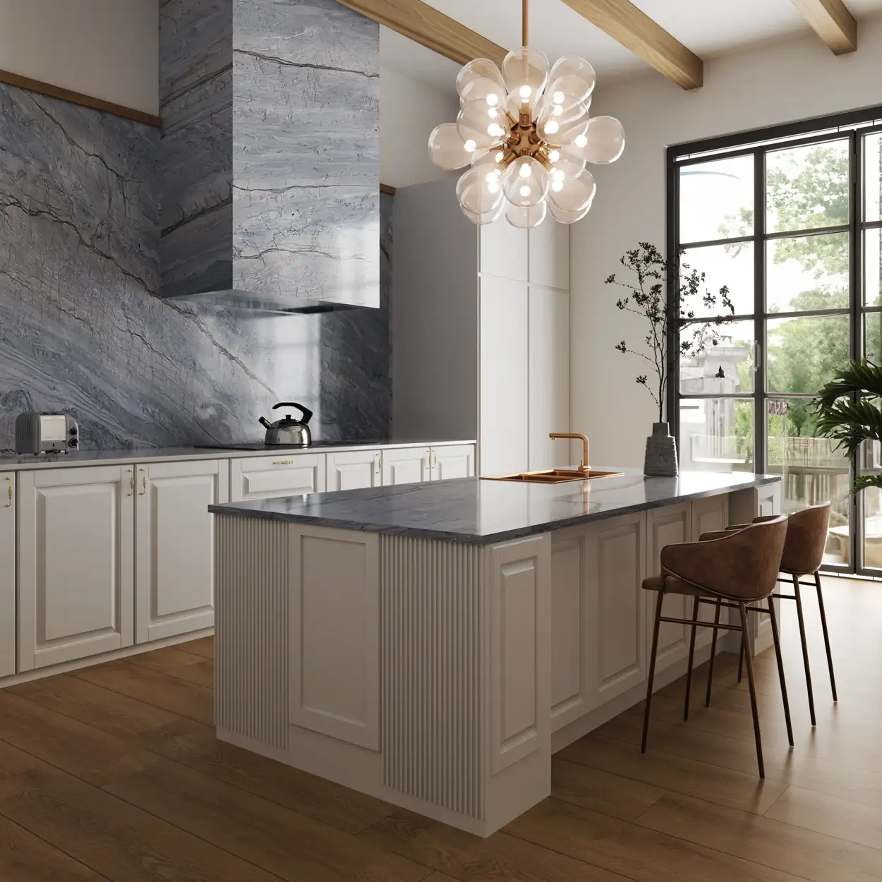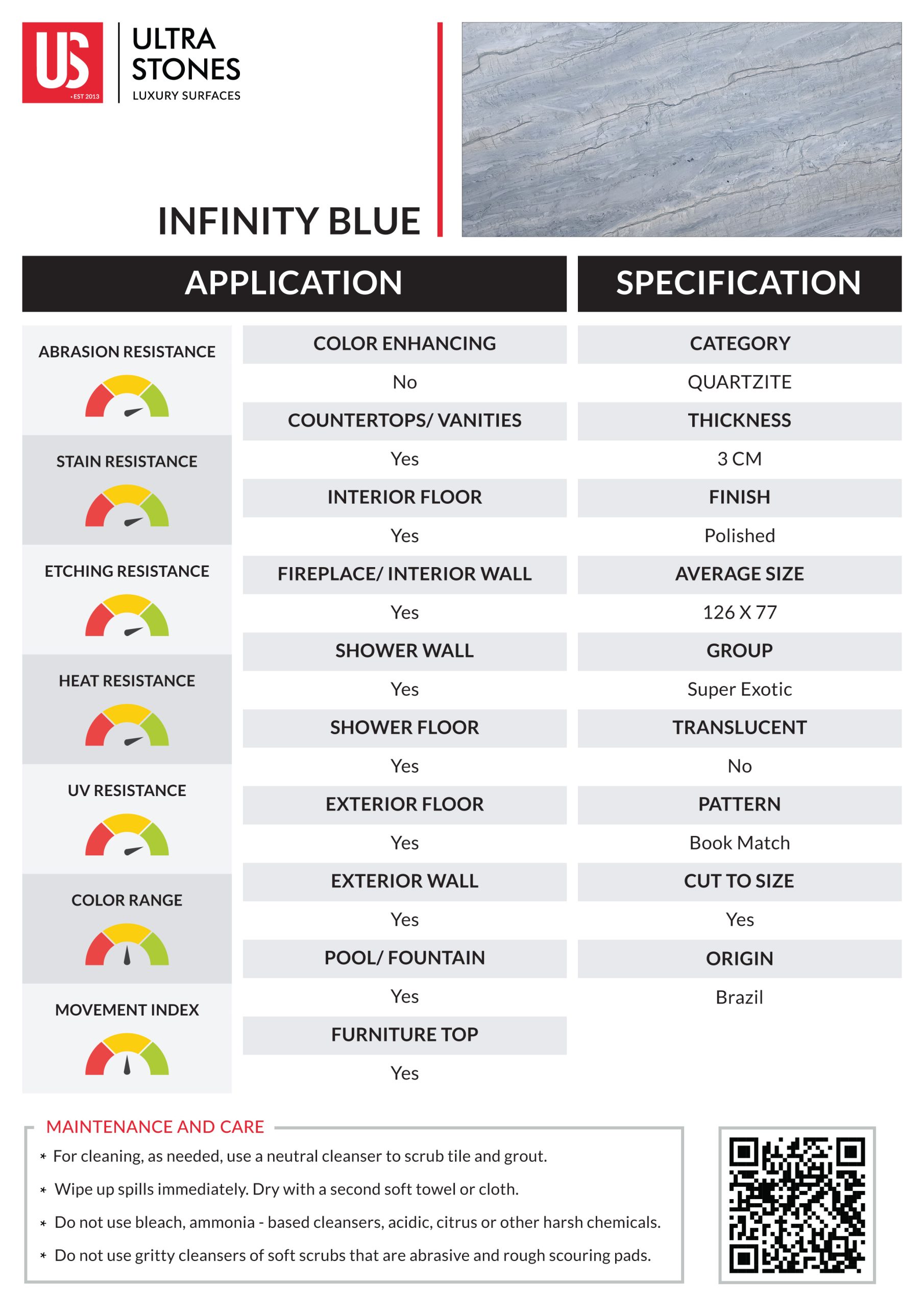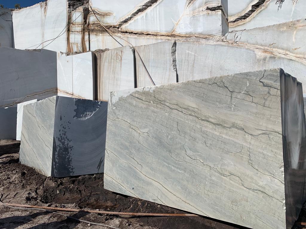 Infinity Blue quartzite is prized for its delicate color combination. It has a gentle slate grey background with a blue accent. Angular veins in mild lunar green and beige stretch over the surface in perfect harmony. The humble palette of Infinity Blue quartzite makes it an excellent choice for designing serene and inviting spaces, allowing for versatile design possibilities.