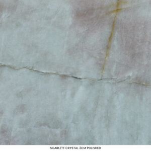 Scarlett Crystal enchants with its irresistible appeal and cutesy palette. Its soft white crystalline surface is complemented by pale pink overtones with occasional golden streaks, adding a touch of luxe to any design setting. Moreover, its translucent nature makes it ideal for backlit accent walls, bartops, backsplashes, and more.