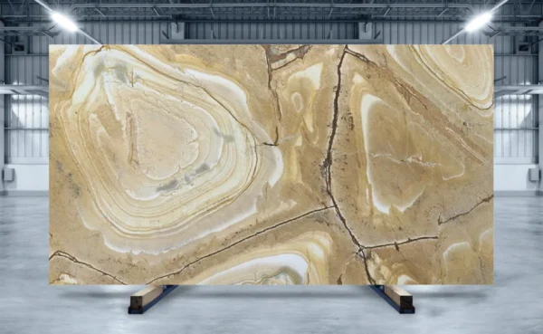 Stonewood is a precious and unique quartzite with remarkable appearance and durability, Quarried in Brazil, this stone features tree rings in golden brown and white hues, resembling the textures of wood. The semi-translucent surface of Stonewood can be backlit, highlighting its amazing colors and patterns. Its natural beauty makes it a desirable choice for statement countertops, bar tops, accent walls, table tops, and more.