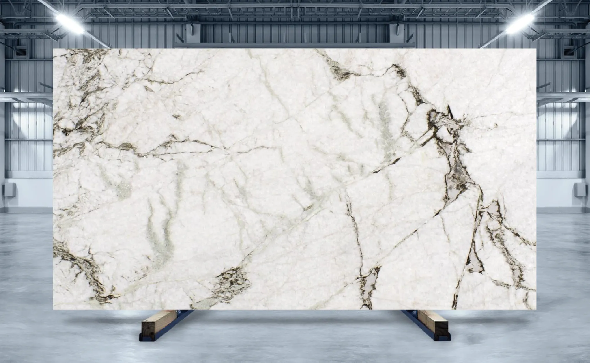Tiffany Crystal is a stunning quartzite with a snow-white background highlighted by subtle taupe and prominent grey veins. The gorgeous interplay of light and dark hues gives this stone a characteristic depth. Its neutral palette blends seamlessly with traditional and modern design schemes. Create bright and airy spaces with our pristine Tiffany Crystal quartzite.