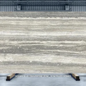 Sourced from Italy, Ocean Blue Travertine is known for its muted palette and understated elegance. This stone features soft, linear striations in bluish-grey, white, and beige hues. This natural stone is a perfect choice for creating cohesive and inviting spaces. Its exceptional resistance to external impacts contributes to a space’s overall durability.